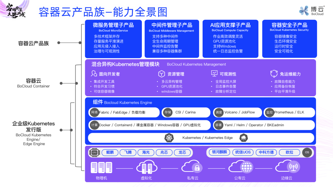 博云在云原生领域深耕多年,在容器领域一直保持技术创新和产品创新。今年5月23日,博云又全新发布了博云容器云产品族,提出了以“为应用赋能”的理念,围绕该理念打造了以应用为中心的敏捷、自运维、安全的云原生操作系统,来实现“Any APP on Any Kubernetes”的开创性建设目标。