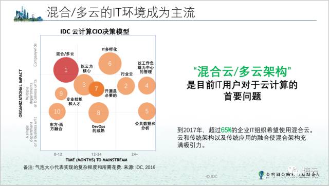 她提到,现在云计算进入了2.0时代,云将向行业化、混合架构、可信以及依据渠道调节的方向逐步转变。在数字化转型时代融合架构将是将来发展的大方向,既包括企业在自己数据中心内部架构的传统架构,数据中心虚拟机和内部云资源还有外部云资源,通过这样的混合云一站式管理平台来支持工作,帮助用户进行上层的运用。