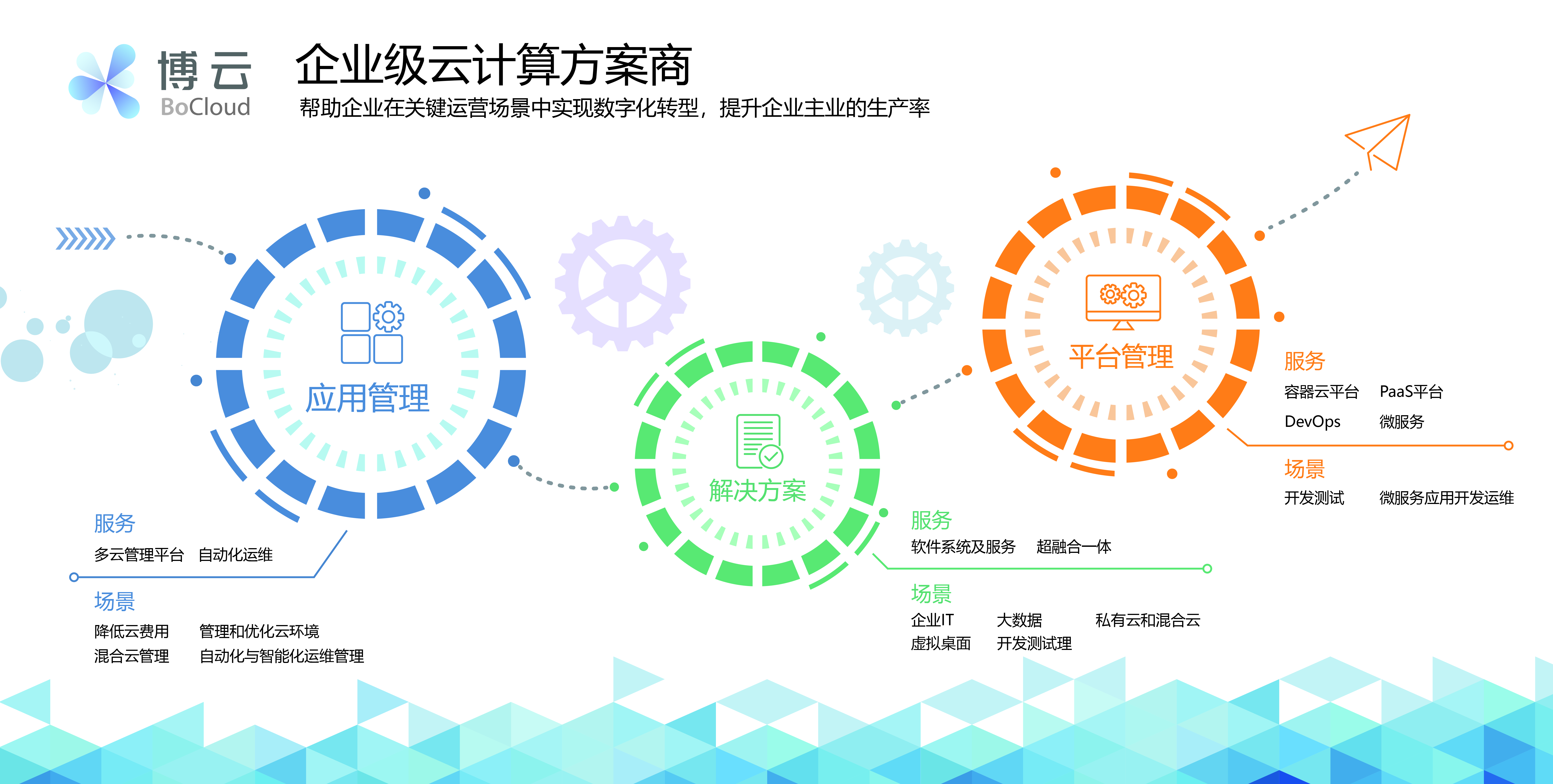 博云在为传统企业提高生产效率方面不断探索。博云系列产品能够支撑起企业核心业务,为企业构建数字化高效的IT系统,使企业客户能够专注在自己的核心业务,迅速响应市场需求,进行业务创新。
