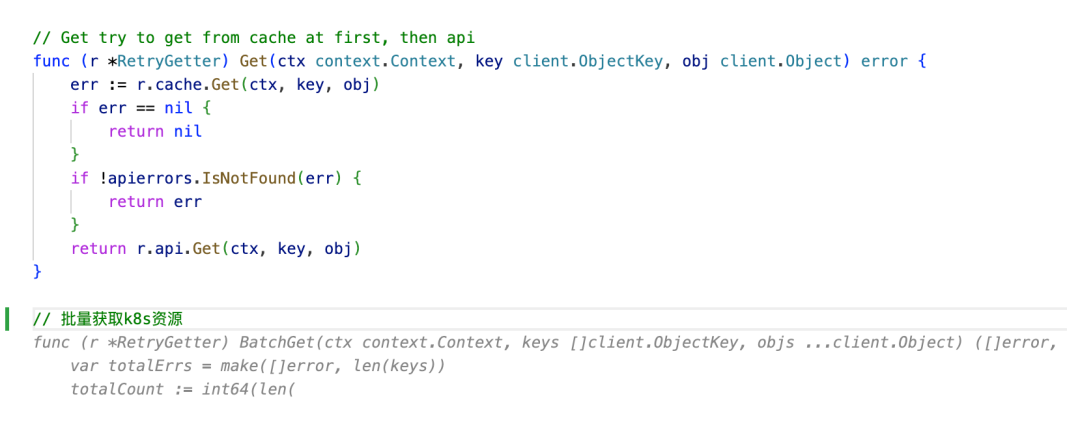 举个例子,我需要实现一个用于批量获取k8s资源的功能。我向模型描述了这个函数应该做的事情。然后,模型就会智能地分析已有的代码片段和上下文,为我提供准确的建议。