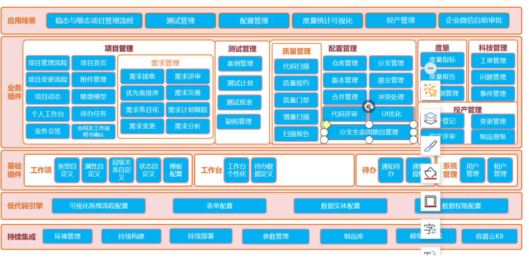 整合科技管理工具链,构建全栈信创、自主可控、低代码、高度可配置化的DevOps体系。
