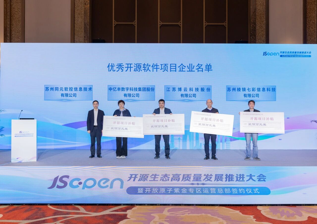 大会表彰环节,博云科技凭借在开源技术研发、行业场景落地及生态协同方面的突出成果,与苏州同元软控信息技术有限公司、中亿丰数字科技集团股份有限公司、苏州棱镜七彩信息科技有限公司一同入选 “优秀开源软件项目企业”,领取苏州市专项资金支持,获得优秀开源软件项目补贴。