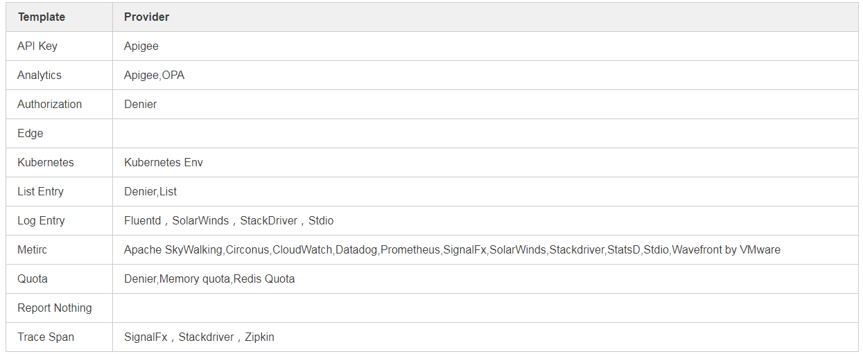 该项目构建了一个可扩展的策略管理机制,允许其他技术可从多个方面与Istio集成,请参阅下面的“template”列表以及一些集成的提供者。你可以认为“template”是一种集成。