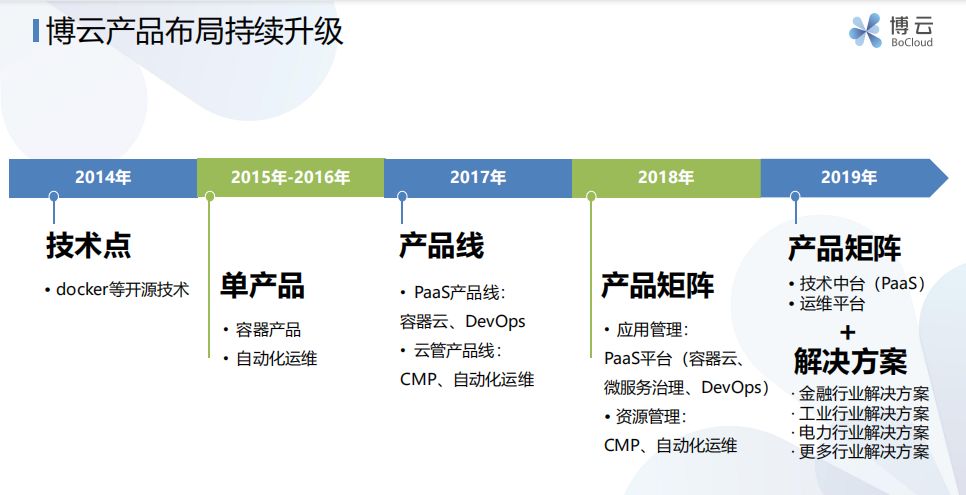 直至2019年,博云的产品矩阵趋于完善,在应用管理PaaS平台的基础上,博云开始打造“PaaS技术中台”,同时将资源管理产品向一体化的云管理和运维平台发展。