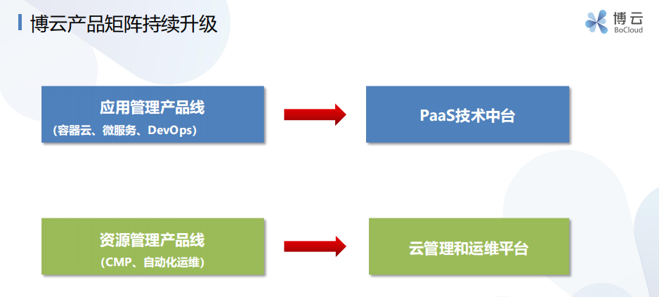 目前博云的产品矩阵,是指融合了容器、微服务、DevOps等能力的“PaaS技术中台”,以及拥有CMP和自动化运维能力的“运维平台”。