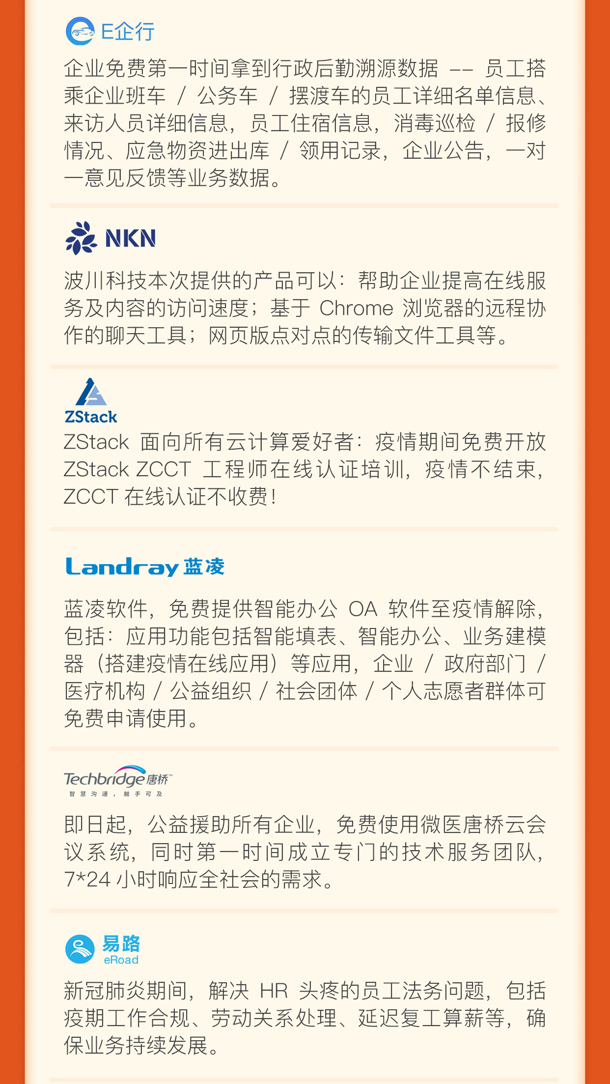 远程办公类:服务于有远程办公需求的企业和政府机构,包括免费的协同办公产品、在线办公服务、远程视频服务、直播会议服务、云计算资源等;