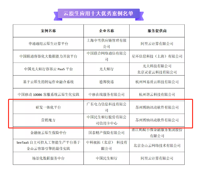 由博云提供产品及实施服务的“中国民生银行股份有限公司信用卡中心——营销魔方”和“广东电力信息科技有限公司——研发一体化平台”入选本次云原生应用十大优秀案例,证明博云在云原生技术领域优秀的技术能力和丰富的行业落地经验,帮助企业级客户实现传统业务与创新技术深度融合,支持创新型业务发展。