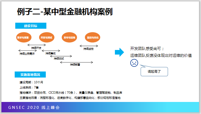 第二个是我们某个中型金融机构案例。这个案例建设目标起的比较高,并找了咨询公司做了咨询。咨询公司做的东西确实比较好,比较完整也比较细致。整个的建设目标包括开发管理、持续集成、测试部署、持续监控的,规划的很完整。