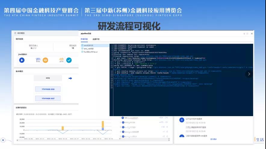 这个是项目里面的截图,整个研发流程,变得可视化了,而不是像以前的黑盒,通过传统汇报的机制,项目进行百分之多少,写一个日报,以前经常去做分解,去做 WBS 分解,现在通过平台完全看得到流水线状态,整个研发状态、研发的人每天在做什么事情,把流水线展开之后,看得到每一个阶段编译的时间是什么样的、涉及到的需求有哪些、最后是不是有出现问题、出现问题我的日志是怎样的,都可以追踪出来。