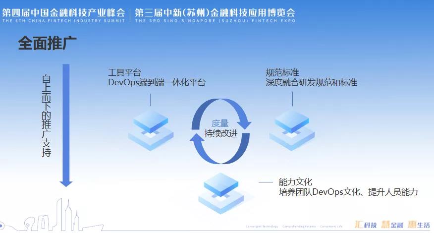 至于我们未来要做哪些事情,首先在平台建设完成之后,大家原来用的工具很多,但是平台逐步在用的过程当中,第一是自上而下的推广,平台让大家全部使用起来,但是所有的反馈和持续的建设,一定是从下往上逐步反馈的,所以这个本身来说,就是一个持续改进的过程,我的 DevOps 平台,一定要靠自己运转起来的,不是靠供应商持续给我们提供服务,需要我们自己的研发人员,自己的管控人员持续做度量和分析,最终实现平台真正规范的落地,这个才是我们精细化管理和研发效率提升最主要的方向。